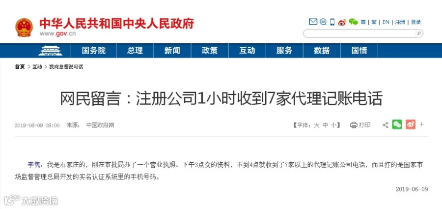 日前,有网民在中国政府网留言:注册公司后,法人等手机号全泄露被骚扰。