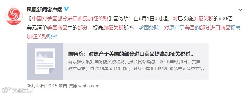 5月20日消息,财政部日前发布了《国务院关税税则委员会发布公告决定对原产于美国的部分进口商品提高加征关税税率》的公告。自2019年6月1日0时起,对已实施加征关税的600亿美元清单美国商品中的部分,提高加征关税税率,分别实施25%、20%或10%加征关税。对之前加征5%关税的税目商品,仍继续加征5%关税。