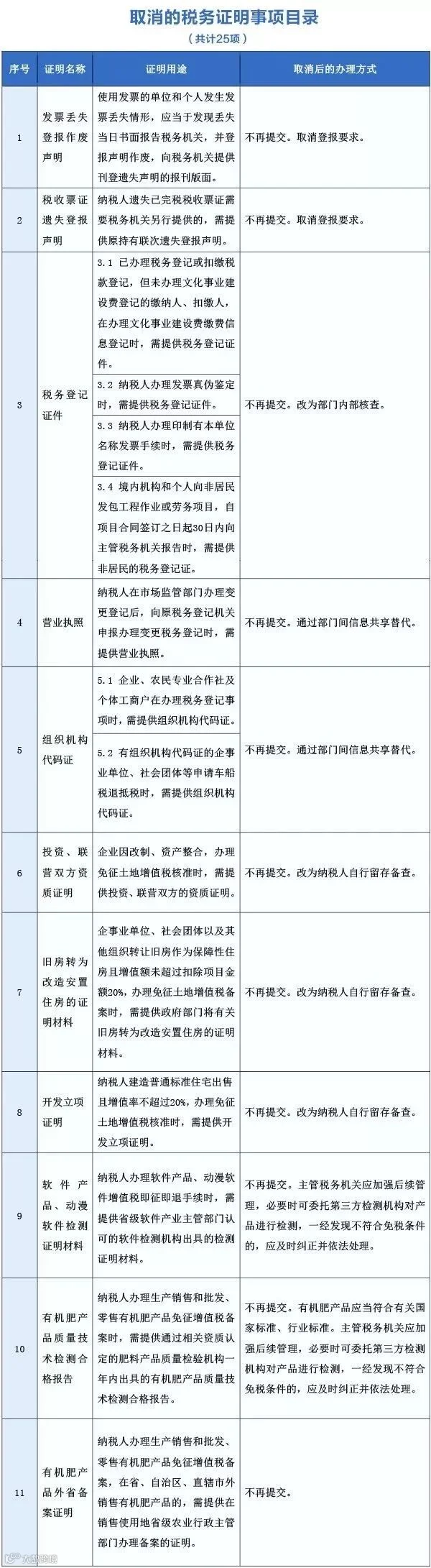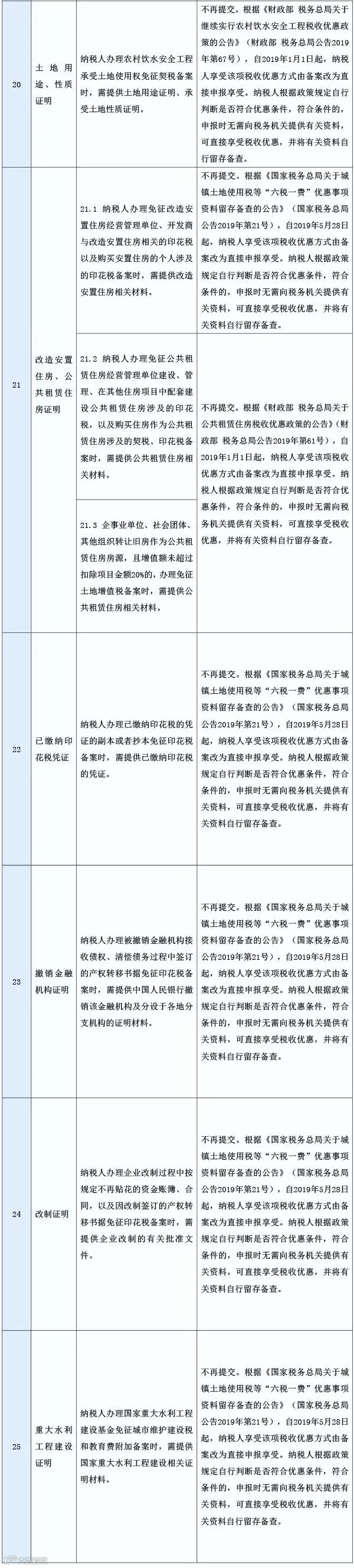 (一)公布取消25项税务证明事项