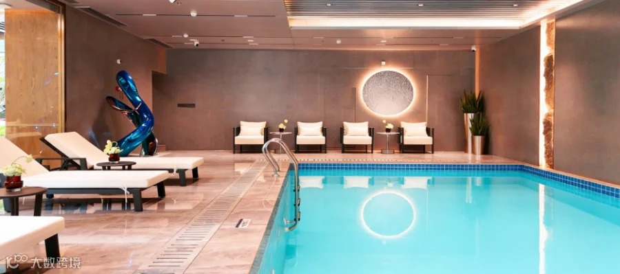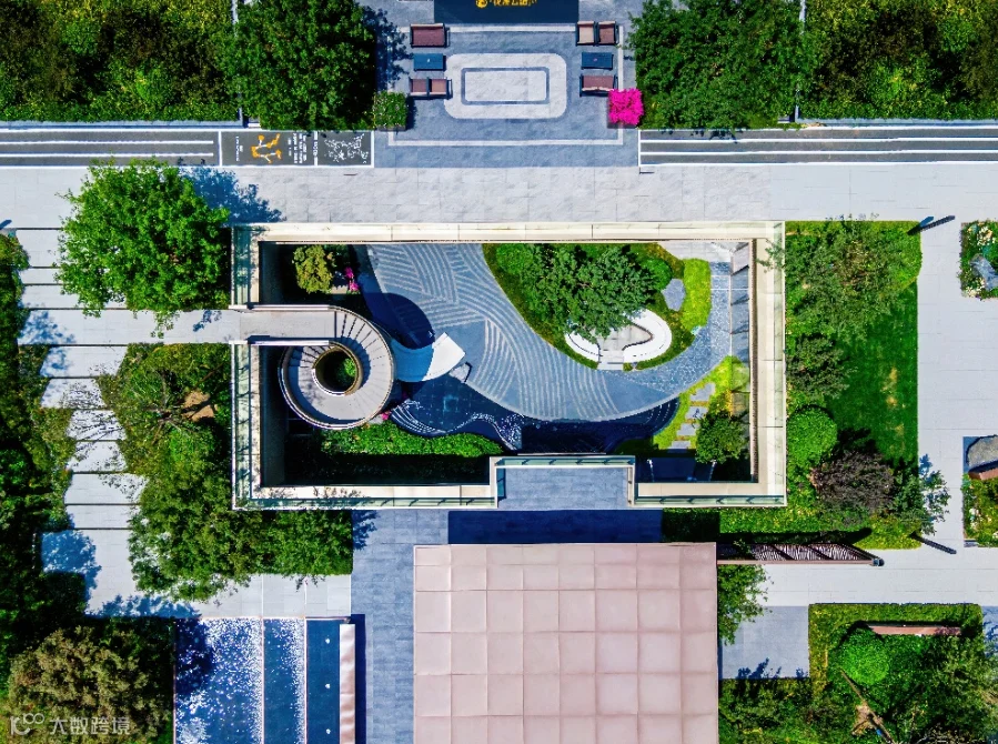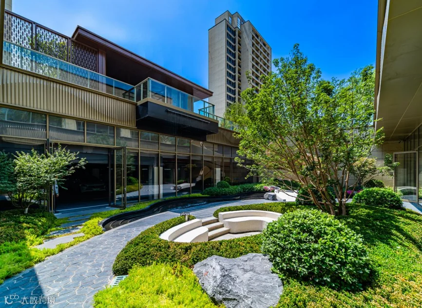 听得到的水声: 下沉庭院内,弧形水幕与带状溪流相映,中央庭园的“八音涧”灵感,则让园林不止可赏,更可聆听。