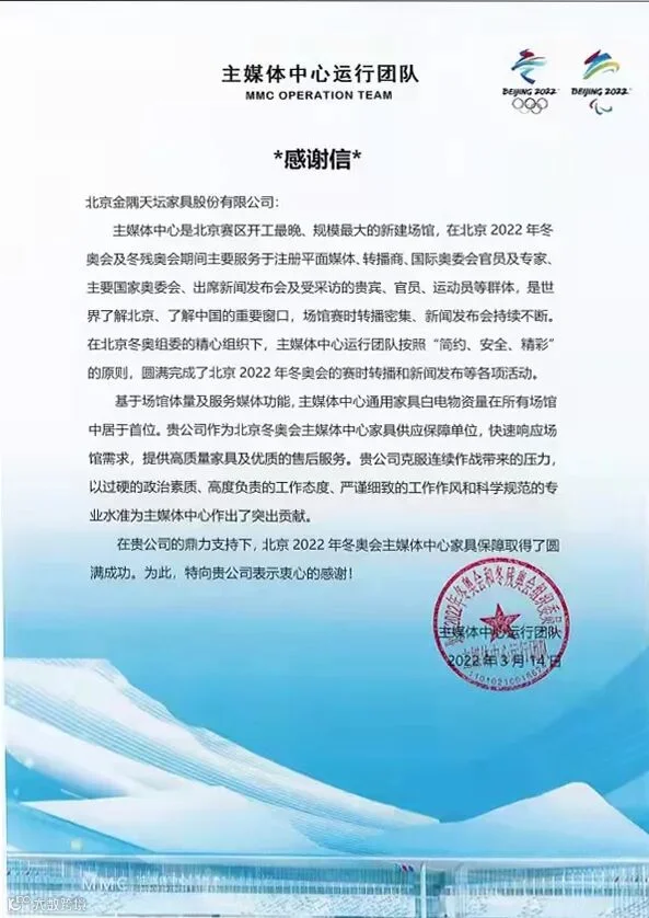 主媒体中心是面向世界展现中国的窗口,金隅天坛家具作为主媒体中心的保障单位,快速响应场馆需求。以过硬的政治素质、高度负责的工作态度,为主媒体中心做出了贡献。