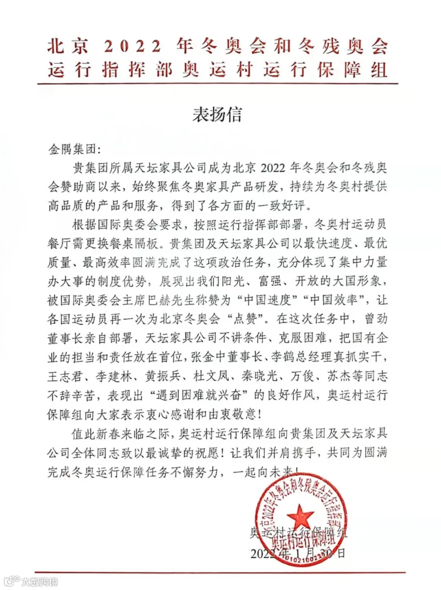 临近赛时,根据国际奥委会要求,按照运行指挥部部署,冬奥村运动员餐厅需要更换餐桌隔板。金隅天坛家具公司以最快速度、最优质量、最高效率圆满完成该项任务。事后,金隅天坛家具公司也得到来自奥运村运行保障组的高度评价与赞扬。