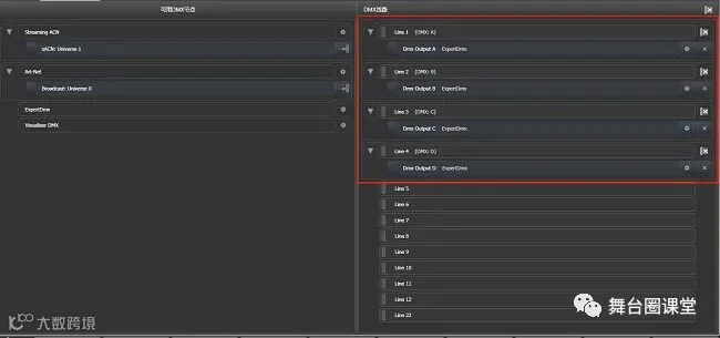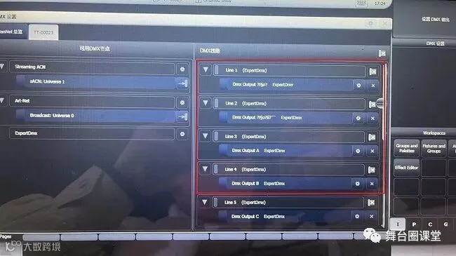 有学员咨询,老虎控台在维修过之后,发现控台没有输出,检查DMX线路分配页面,输出口显示异常。(如下图)从图片中可看到输出口显示异常乱码。