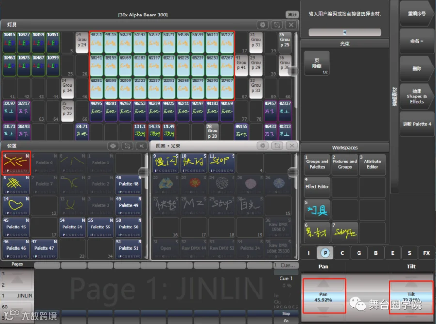 2、选择需要修改的素材后,控台会自动调出素材里面的灯具及属性。