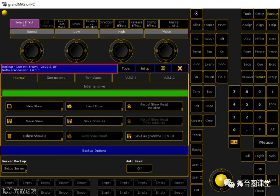 二、弹出“Backup- Current Show:”5643”.[Feb18.2022 19:59]”窗口→选择“Internal”→点击“New Show”→弹出“New Show”窗口→点击 “Show Name”文件条框里面的“+”号→弹出“Keyboard”窗口,这里可以输入新的演出文件名称→点击“Please”按钮。(备注:2022.2.18是我新建的演出文件名称)。(如图所示)