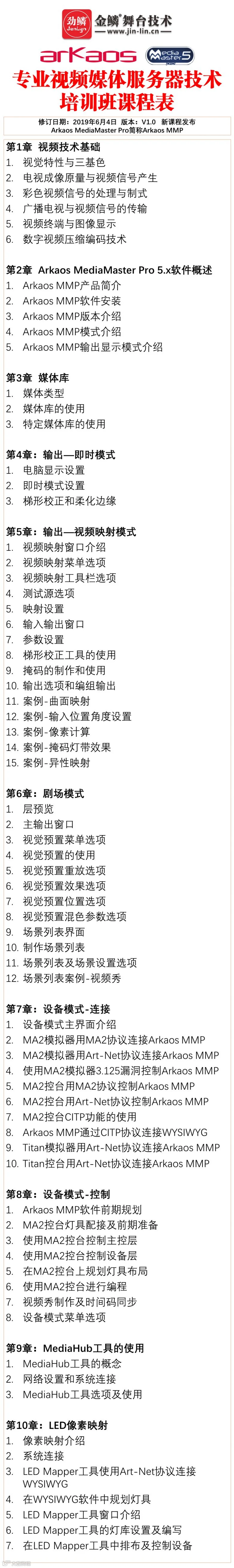 2019年6月,金鳞舞台技术已经已经完成Arkaos MediaMaster Pro软件控制技术开发工作,视频教程也已经录制完毕,并正式开始Arkaos MediaMaster Pro软件的技术培训和支持工作;使国内外广大的视觉创意工作者能够尽快地学好、学会、掌握这些控制技术,并在现实工作中灵活运用,创意出更多璀璨夺目的灯光视觉效果,创造出更多文化价值和经济效益。
