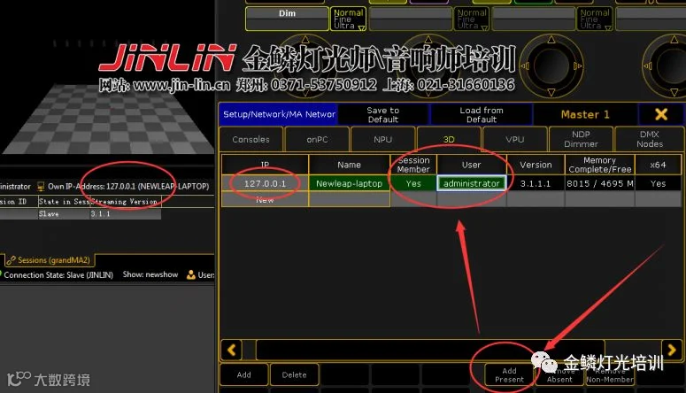 最后,在MA2 onPC上点击Setup,再点击MA Network Configuration,再选择3D选项卡,点击Add Present,再将出现的MA3D设置为会话成员即可连接成功!
