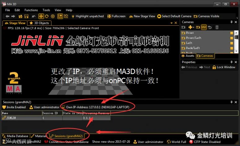 然后打开相同版本的MA3D软件,设置IP地址,如下图所示(PS:更改了IP,必须重启MA3D软件!这个IP地址必须与MA onPC保持一致):