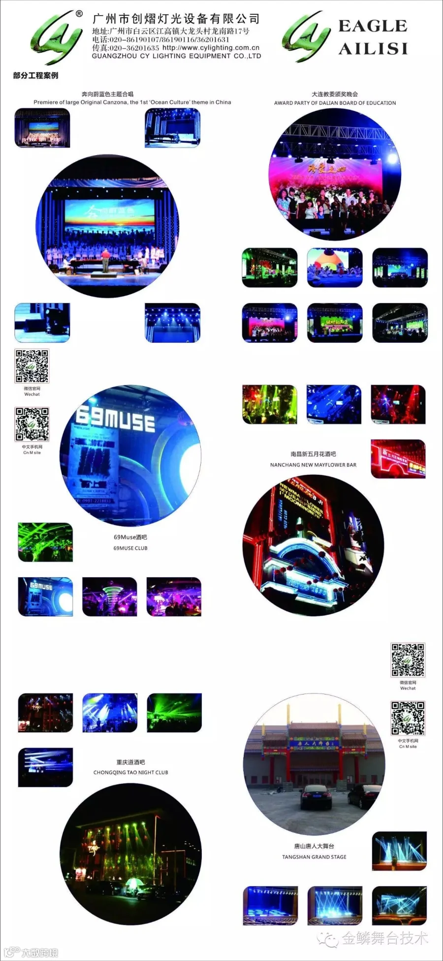 创熠灯光设备有限公司是一家集舞台灯光设备的科研、生产和销售一体化科技型企业,坐落在美丽、发达的中国南方中心城市 广州,距今已经十余年专业灯光设备制造经验。创熠灯光倾心打造的“AILISI”、“EAGLE”品牌在灯光行业具有相当知名度和影响力,其摇头灯、电脑灯、激光灯等系列产品,以质量稳定、效果突出、款式新颖并与国际接轨,从而赢得了国内外用户的信赖。