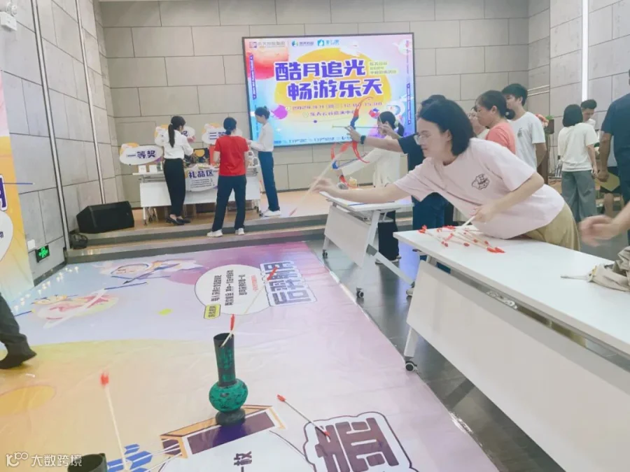 “后羿射月”游戏充满挑战与乐趣,参与者们每人获得两支吸盘箭靶,大家在期待与紧张中瞄准目标,射出箭靶,吸盘箭在空中划出漂亮的轨迹,最终稳稳地粘在目标上,带来了阵阵欢呼和掌声。