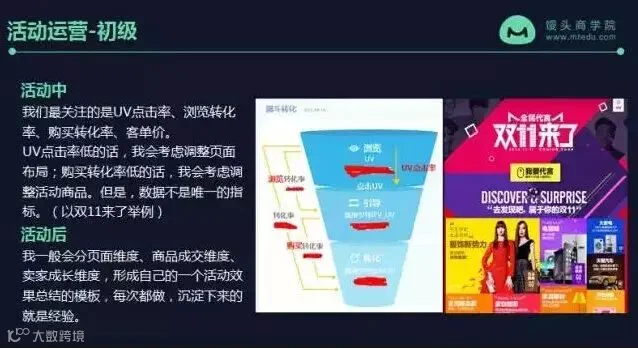 活 动期间,我会密切去关注这个数据,如果发现 UV 点击率低,也就是说到了双 11 来了这张页面来了很多人可是点击的很少,我就会考虑调整页面布局,或者调整 Banner 上每一个区块的文案或者图片,让他更加吸引人有点击的欲望。如果我发现这张页面购买转化率低的话,我会去调整活动商品,可是这个商品不够吸引人。但是数据 也不是唯一的指标。