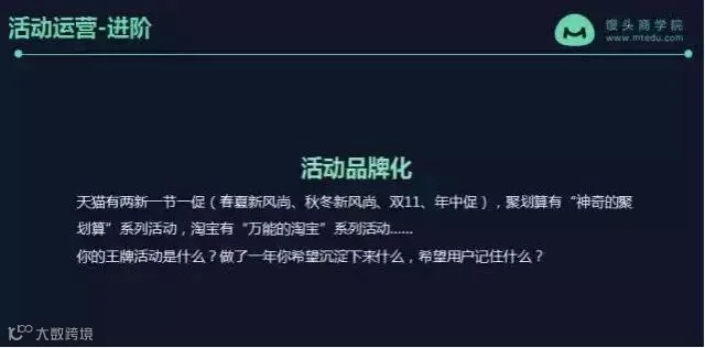 不 知道大家知道吗,天猫有两新一节一促,两新是指春夏新风尚、秋冬新风尚,一节是指双 11,一促是指年终促,是天猫最大的四个活动,是已经有一定的知名度了,它的一个招牌品牌化的活动。聚划算有 " 神奇的聚划算 " 系列活动,淘宝有 " 万能的淘宝 " 系列活动 …… 你的王牌活动是什么呢?做了一年活动你希望沉淀下来什么,希望用户记住什么?我相信你一定不想让用户记住你只是在卖卖卖,在做各种促销。那你是希望有一些 品牌的东西,或有一些用户心智的东西留下来,所以你一定要做活动品牌化。