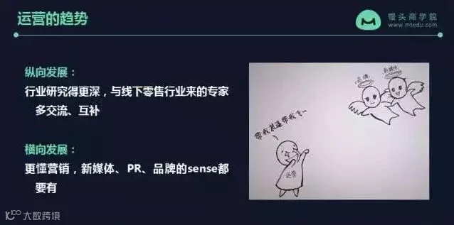 在 我眼里运营会往什么趋势发展呢?一个是纵向发展一个是横向发展。纵向发展每个行业会研究得更深。像阿里有一些新增的运营都是从线下各个零售行业进来的专 家,如果大家能线上线下把这些经验去结合,多交流,多互补的话,对于你对行业的研究认识会更加深入。还有一种是横向发展,在你有了一定的运营经验之后,你 去研究一些营销的东西,懂新媒体、PR、品牌的东西会更有利于你的发展。所以我应该算是走的第二条路,也是为什么我又到了天猫市场部,也引出了我们下一部 分内容: