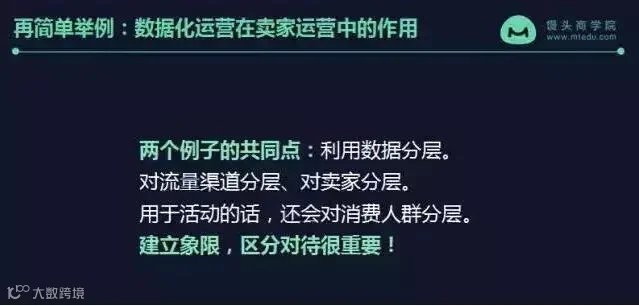 其 实我们刚刚说的这两个例子,它们有个共同点:利用数据分层。不管是对流量渠道分层还是对卖家分层。数据用于活动,我们还会对消费人群分层。综上,我感觉就 是:我拿到一个问题,或拿到一个 case,我会不自觉的画一个象限,把这个渠道也好或问题也好分成四个象限,建立象限,区分对待很重要。