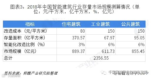 在存量智能建筑规模测算方面,我国每年约3%(平均改造周期30年)的住宅以及6%(平均改造周期15年)的工业、公共建筑会进行智能化改造,按住宅每平米80元、公建150元的平均改造成本计算,2018年我国建筑智能化改造市场规模为2356.55亿元。