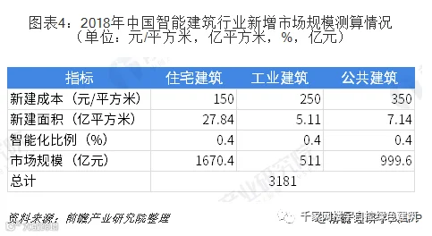 图表4:2018年中国智能建筑行业新增市场规模测算情况(单位:元/平方米,亿平方米,%,亿元)