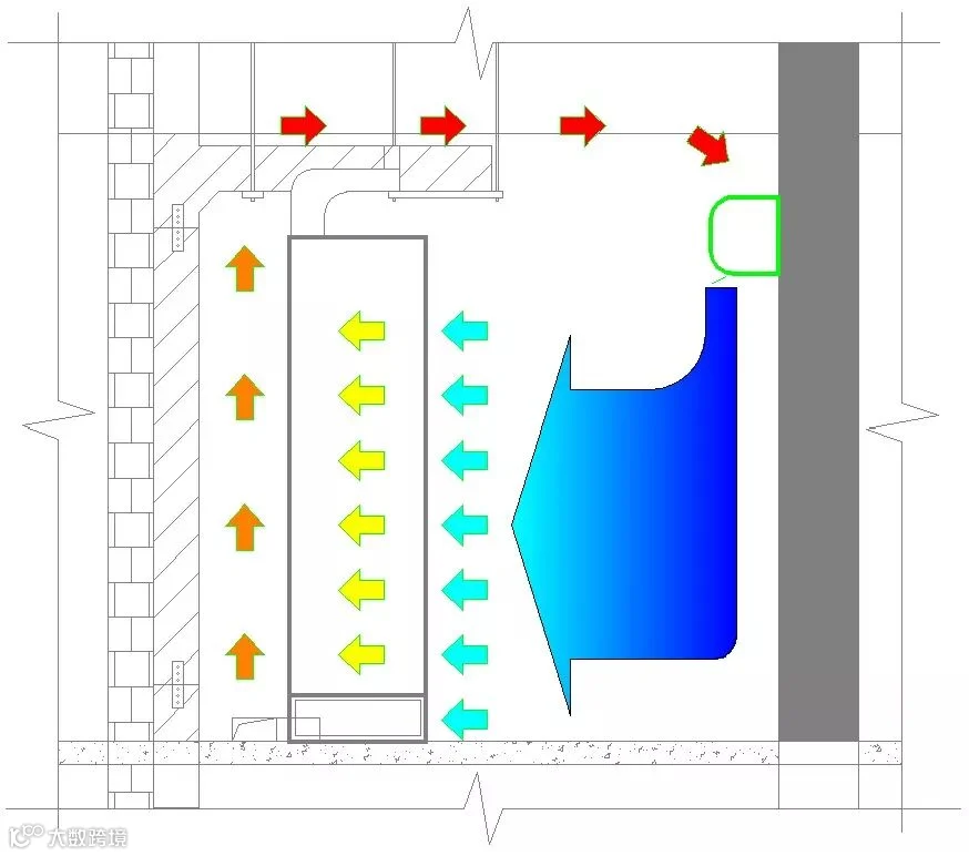 气流组织图,前进层从后方上方挥分,虽然基本满足了电信间温湿度要求,但是还是有几个问题未解决:一是控制空调不方便;二是空调室外机无专用安装位置;三是室内无排水设施。通过我们的研究,最佳方案是多联机空调模式,通过智能控制器或者智能面板远程对空调进行调节和控制。需要注意的是一般室内外机高差不超过+50米(外机高于内机为+),冷媒管管长不超过100米。