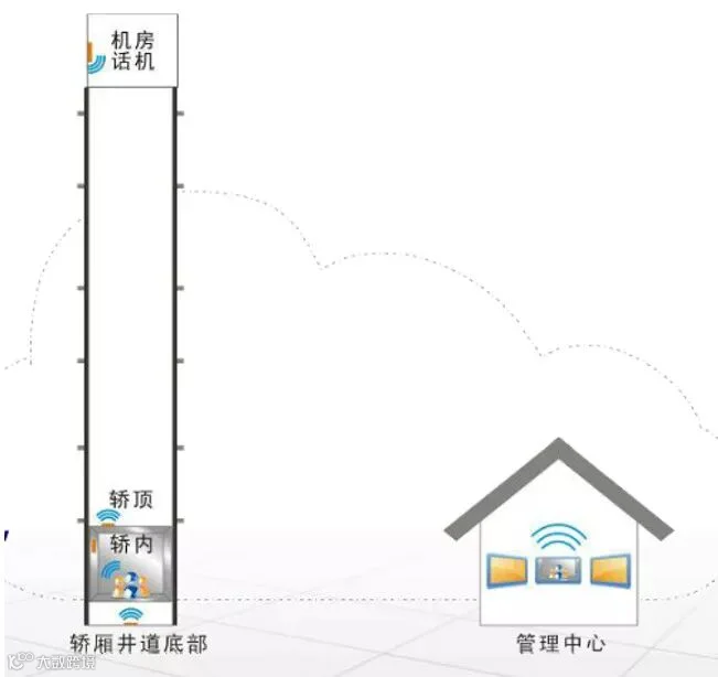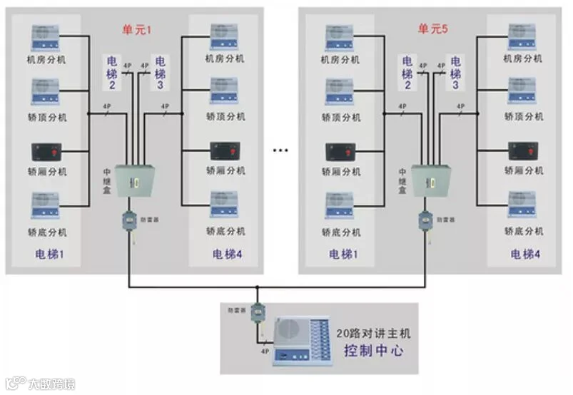 Ø管理中心机可与电梯轿厢、电梯机房、电梯顶部、电梯底部分机实现五方对讲;