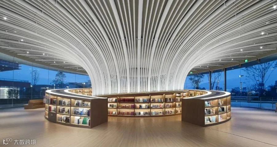 知也·图书馆的设计师沿用斐波那契数列的仿生美学,以瀑布为圆心轴线,设计螺旋向上的楼梯式环廊,连接地下与地上的两层空间,让整个空间内部都圆润温暖,营造更适宜阅读的静谧氛围。