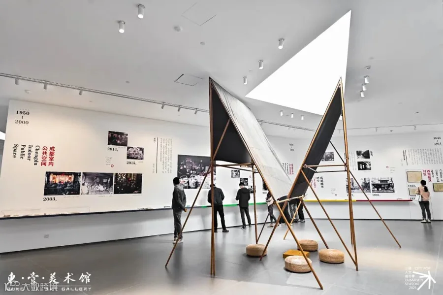 几条笔直的折线,4个落地的蒲团,一盘下到一半的围棋,城市家具《合江亭》用建筑语汇勾勒了成都的日常生活,也呼应着这座长江上游城市的悠久历史;一组由冯立拍摄的跨度二十年的照片,展开了城市表情变化;一系列影音资料,记录了白夜酒吧畅聊文学的夜晚,也记录下小酒馆乐队演出的燥热。展示成都城址格局演变的古地图与新落成的東·壹美术馆以及成都东部新区这一充满了科技与未来远景的新区块形成了某种有趣的映照。