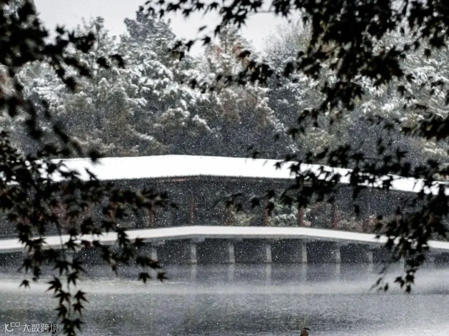 两岸树木褪尽铅华,托着积雪,如同在宣纸上晕开的一滴墨汁,连同水榭和远山都被笼罩在一片柔软的模糊影子中。