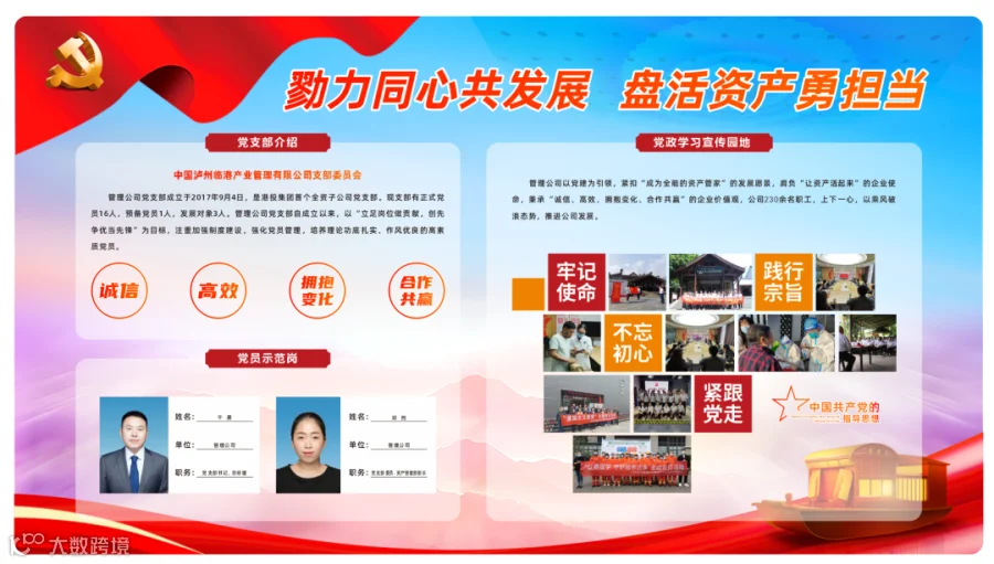 今年,文创公司组建项目服务专项小组,从客户服务、文案策划到方案设计、后勤保障,针对每个阵地项目展开头脑风暴,不断自我推翻后优化升级,汇集全员合力,形成项目方案30余稿,确保抚琴台社区办公阵地、泸县社保局办公阵地文化建设、泸州市市政公用服务中心党建阵地、众爱公司党建阵地等相继落地,促进公司业务从重点领域衍生。