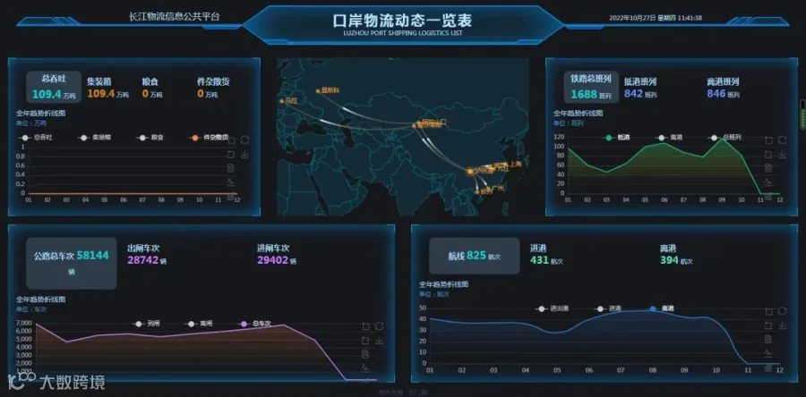10月27日,完成综保区“泸州港航运物流一览图”功能开发,实现了泸州港铁、水、公、广州班列、中欧班列箱量数据实时展示。