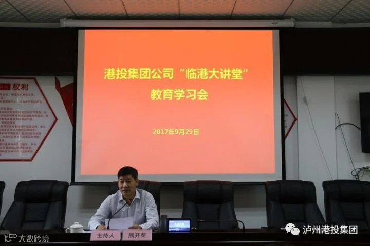 泸州港投集团2017年9月29日下午,港投集团公司党委书记熊开荣同志主持召开“临港大讲堂”教育学习会。集团公司工程部舒跃邦同志作了《如何当好甲方代表》的专题交流学习,使大家对如何做好工程项目管理有了进一步的认识;集团公司党群工作部杨建超同志以《雄安·故乡》为题,为大家介绍了故乡雄安新区的发展现状及风土人情。会上,熊书记再动员再部署了党风廉政建设社会评价工作,强调中秋、国庆期间廉洁纪律相关要求。