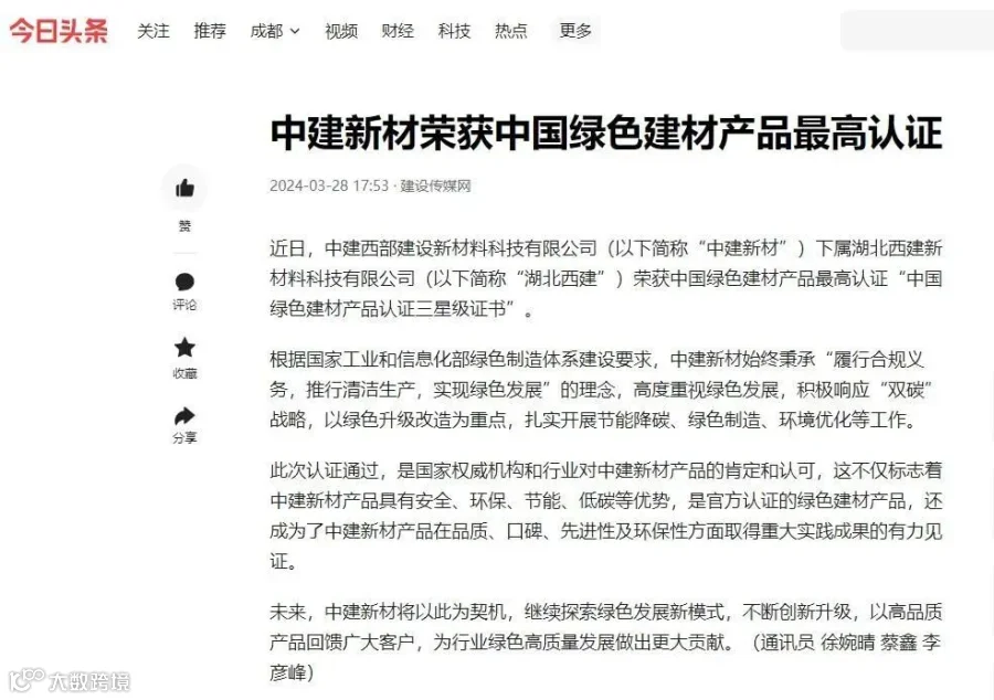 近日,中建新材所属湖北西建新材料科技有限公司荣获中国绿色建材产品最高认证“中国绿色建材产品认证三星级证书”。