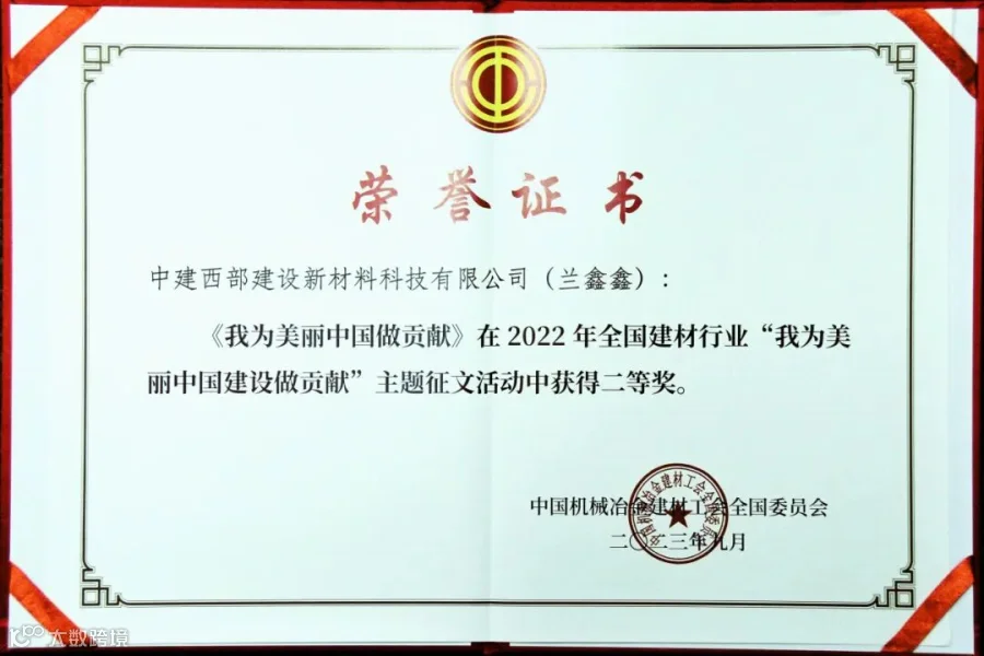 近日,全国建材行业“我为美丽中国建设做贡献”主题征文结果公布,中建西部建设工会14名职工荣获征文比赛奖项,其中一等奖1名,二等奖4名,三等奖9名,中建西部建设工会获优秀组织单位称号。中建新材华中营销大区兰鑫鑫获征文比赛二等奖,陕西厂徐梦雅获征文比赛三等奖。