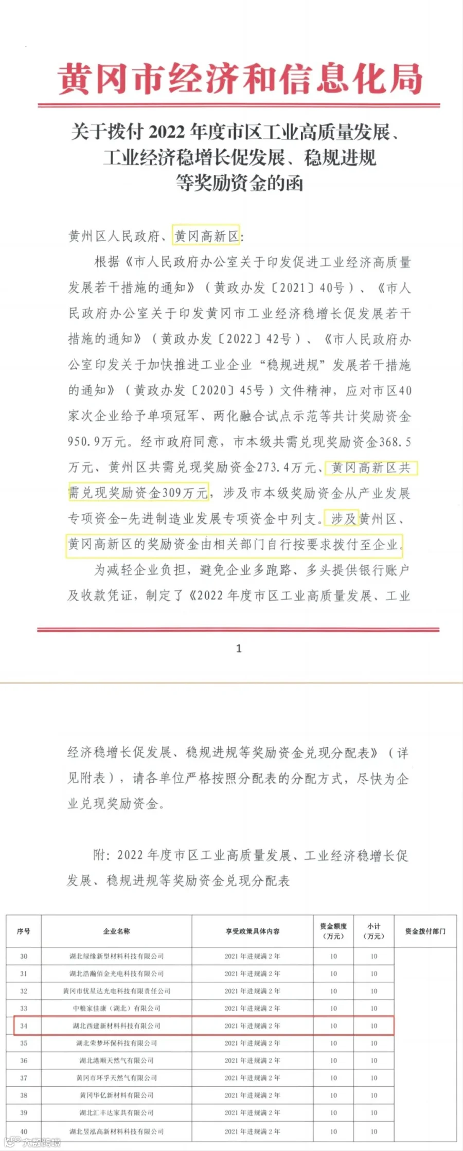 近日,湖北西建新材料科技有限公司(以下简称“湖北西建”)收到了黄冈市稳规奖励资金10万元。