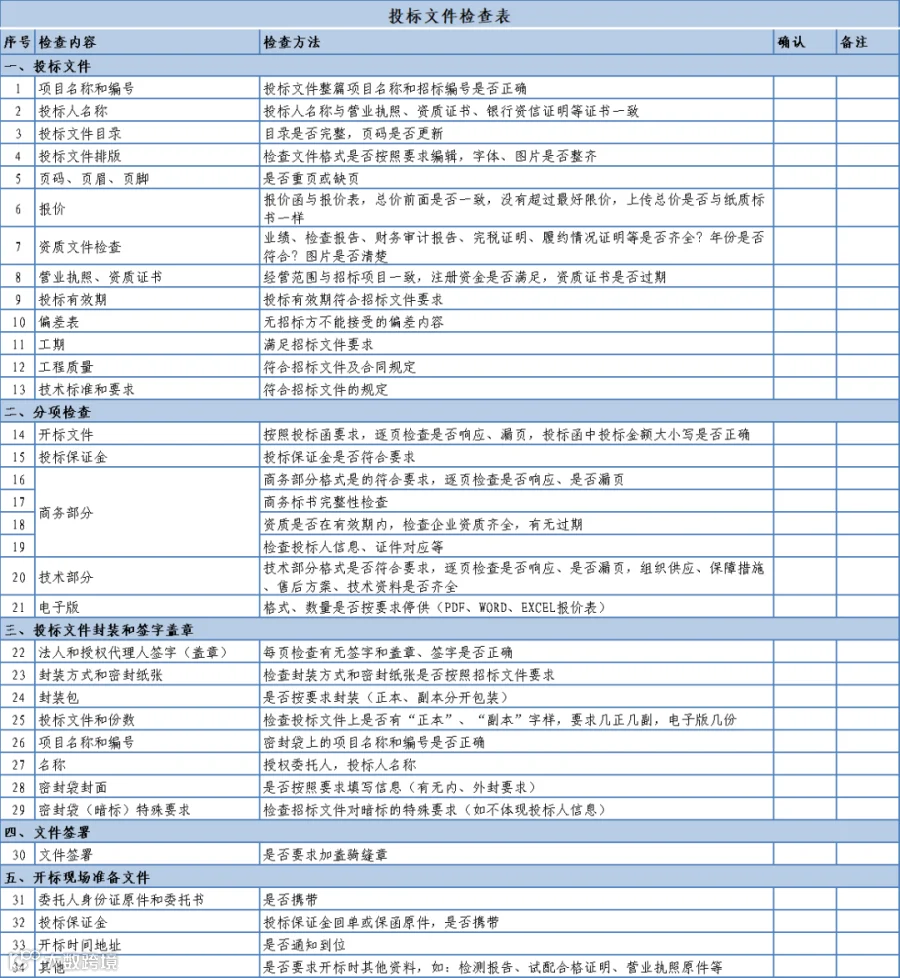 下面为大家整理了一份投标文件检查表,