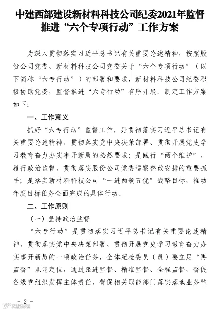公司纪委督促公司党委切实履行主体责任,成立工作领导小组,发布2021年度“六专行动”工作方案,组织“六专行动”各责任部门认真学习“六专行动”相关文件及会议精神,不断增强思想自觉、行动自觉。督促党委以半年度为节点召开2021年信息化专项行动推进会,详细落实年度工作部署。