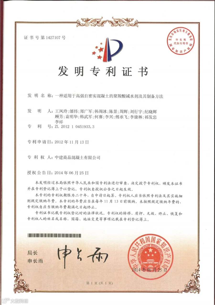 ▲中建总公司科技奖三等奖:高强自密实混凝土高性能聚羧酸减水剂的研制与工程应用