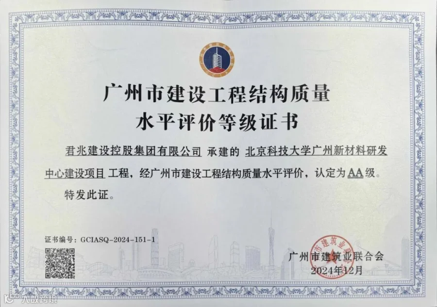 近日,我司负责承建的“北京科技大学广州新材料研发中心建设项目工程”凭借其卓越表现,在广州市建设工程众多项目中脱颖而出,一举获得“广州市建设工程结构质量水平评价AA级”“广州市建设工程安全生产标准化管理水平评价A级”两项荣誉。