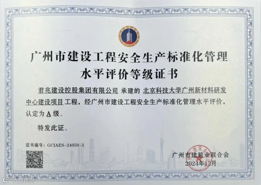这两项荣誉的获得,不仅是对北京科技大学广州新材料研发中心建设项目工程全体建设者辛勤付出的肯定,更是对我司在施工管理、技术创新、质量把控等方面综合实力的见证与认可。君兆建设控股集团将继续秉持“安全第一、质量至上、安固初心”的企业宗旨,继续深化安全生产标准化管理,不断提升工程质量水平,致力于打造更多具有影响力、引领行业发展的精品工程,为推动城市建设与行业发展贡献更大的力量。