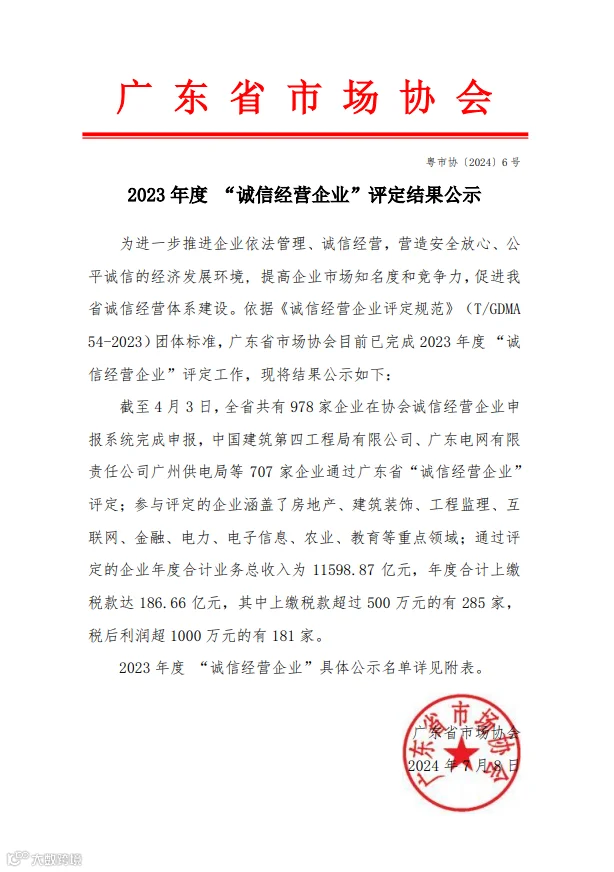 近日,广东省市场协会协会在官网发布了《2023年度诚信经营企业》评定结果,君兆集团荣誉奖项再添硕果,连续两年获得了“诚信经营企业”的称号,彰显了君兆集团在市场的综合实力和良好信誉!