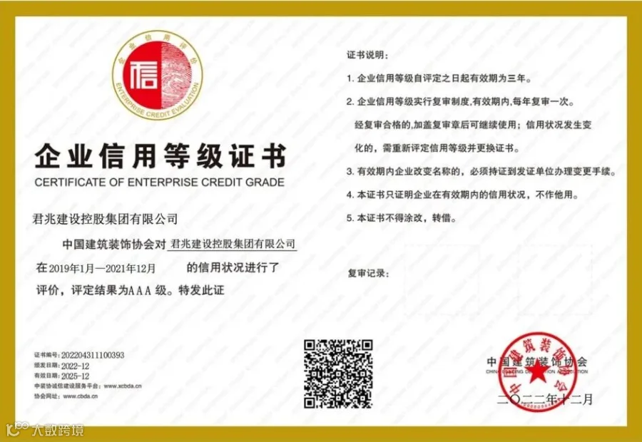 信用强企,诚信经营。通过荣获多项国家级、省级企业信用等级证书,充分展现了君兆集团诚信的品牌形象。君兆集团将以此为动力,继续加强企业信用的建设,不断提高诚信管理水平,发挥自身优势,打造精品工程,为建筑业高质量发展贡献出君兆力量!