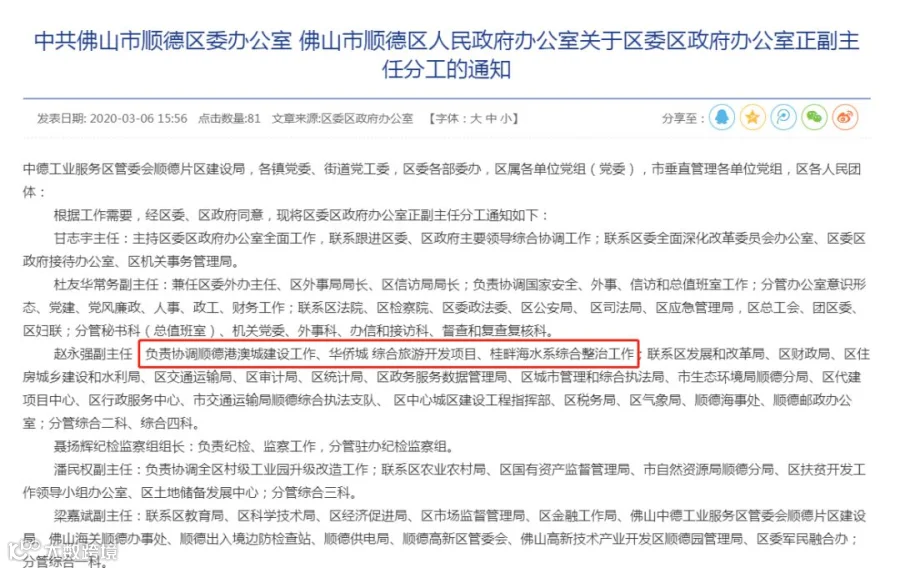 且在最新公布的政府分工中,顺德港澳城建设工作赫然在列,重视程度可见一斑。