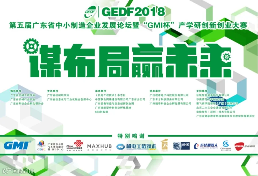 2018年11月16日,第五届广东省中小制造企业发展论坛暨“GMI杯”产学研创新创业大赛在广州阳光酒店成功举行。本届论坛由广东省机械工程学会、广东省机械行业协会、广东省科技企业孵化器协会指导,广东省机械研究所和广东省信息化与工业化融合创新中心共同主办。会议主题为“谋布局赢未来”,邀请国内实战管理专家从新趋势、新品牌、新营销、新制造等多维度进行主题演讲,帮助企业打开新思路、制定新战略,并举办“GMI杯”产学研创新创业大赛,为广大创客、优秀企业搭建展示平台、释放创业活力、提供发展机遇。