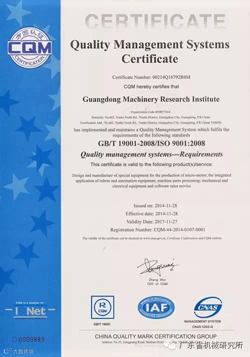 10月30、31日方圆标志认证集团质量体系审核专家组到我所进行为期2天的ISO9001:2000国际质量管理体系认证审核。参加本次认证的部门有现代制造中心、教育事业发展中心、办公室和科研产业办,涉及认证的产品范围包括微电机生产专用设备的设计与制造、机器人及自动化设备的集成应用、机械零件加工、机电设备及软件销售服务。审核组通过对工作场所考察、文件审核、现场询问、抽样调查、文件与操作对照等方式对我所质量体系运行情况进行了全面核查,审核组长赵文举QMS高级审核员代表审核组对我所的质量管理体系运行给予了充分肯定和高度评价。经过评定,审核组核定我所通过ISO9001:2000质量管理体系认证,并于11月28日颁发了证书。