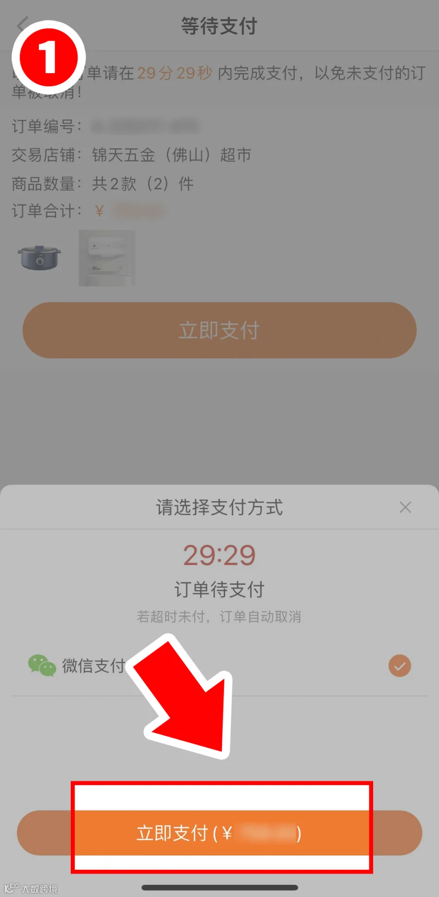 ① 提交订单后将自动跳转至等待支付页面,点击【立即支付】