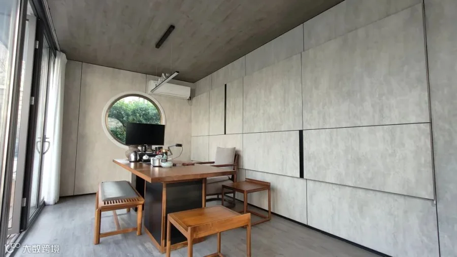 走进茶室,细节处的巧思更让人惊艳,圆形窗的设计,给硬朗的集装箱增添了几分柔和诗意,品茶的同时还可以欣赏窗外的美景。