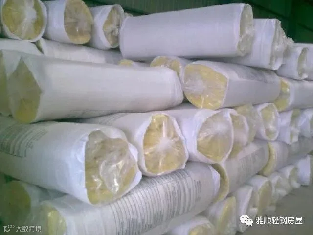 玻璃纤维棉为卷材,规格尺寸为1000×100mm,玻璃纤维棉常用于填充墙体骨架内部、楼面梁及屋盖骨架内,起隔热保温、隔音和防火的作用。