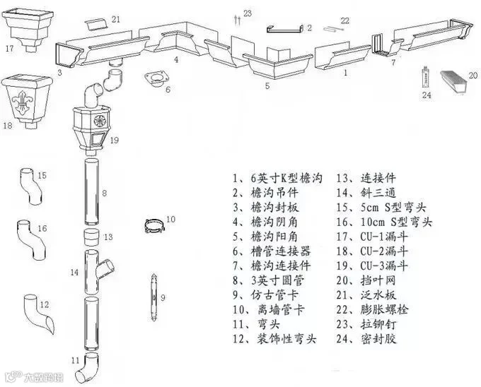檐沟、封板、檐沟连接件(K型檐沟可不用,半圆型檐沟必须用,否则会出现檐沟变形)、阴阳角、吊件、托架。