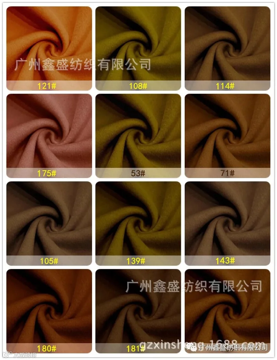 【鑫盛纺织】全毛双面呢现货颜色两百多个,下面色板展示,颜色比较多,亲们可以根据色样选择,我们尽量将拍摄的色样修改的接近实物,但图片跟实物还是有一点色差的,如需看实物,请联系客服哦!