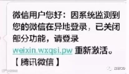 【收到微信帐号异地登录短信时要警惕!】近期很多人收到这样的短信:“微信用户您好:因系统监测到您的已微信在异地登录,并已关闭部分功能,请登录weixin.wxqsi.pw重新激活。【腾讯微信】”。
