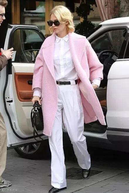 粉色大衣搭配白色连体裤,黑色腰带系上,分割了腰线,知性干练又甜美减龄。