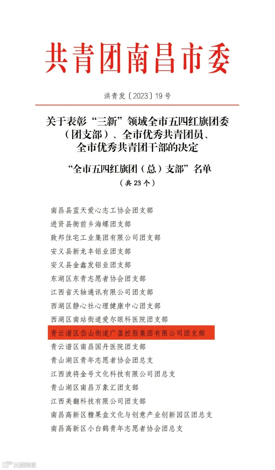 广盈控股集团近日,共青团南昌市委作出表彰决定,广盈控股集团有限公司团支部荣获“全市五四红旗团支部”称号。