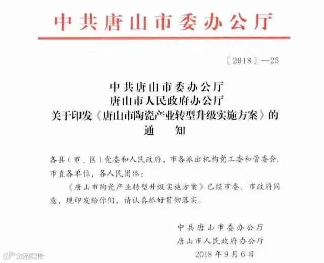 9月6日由中共唐山市委办公厅、唐山市人民政府办公厅联合印发《唐山市陶瓷产业转型升级实施方案》。